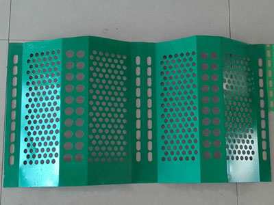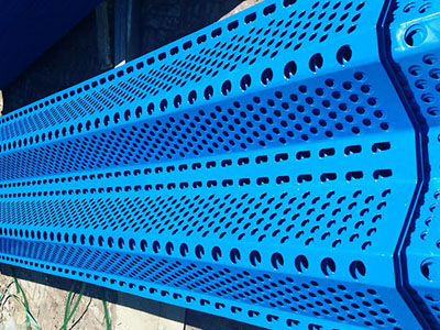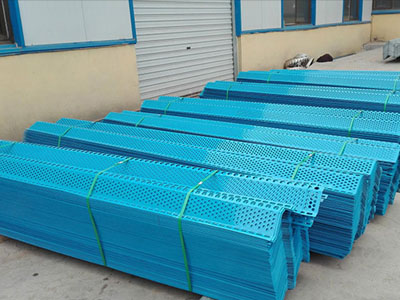 双峰防风抑尘网是利用空气动力学原理,按照实施现场环境风洞实验结果加工成一定几何形状、开孔率和不同孔形组合挡风抑尘墙,使流通的空气(强风)从外通过墙体时,在墙体内侧形成上、下干扰的气流以达到外侧强风,内侧弱风,外侧小风,内侧无风的效果,从而防止粉尘的飞扬。